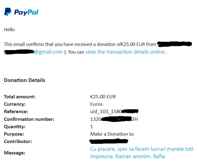 Multumim pentru o noua donatie in valoare de 25 Euro. Donatorul va ramane anonim.